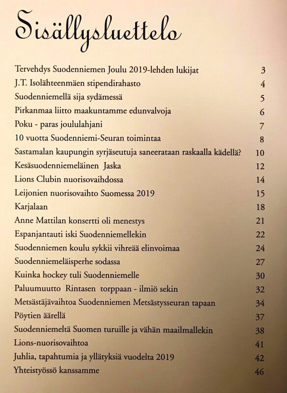 Suodenniemen Joulu 2019 on ilmestynyt! Tutustu viereisessä kuvassa olevaan sisällysluetteloon ja hae oma lehtesi suodenniemeläisistä liikkeistä! Samalla tuet Suodenniemen Lionsien toimintaa kotiseudun hyväksi. Lehden hinta on 10 €. Voit myös tilata lehden postitse kotiin toimitettuna soittamalla Maurille (p. 040 707 0378) tai Erkille (p. 0400 869 362). Hinta toimituskuluineen on 15 €. |